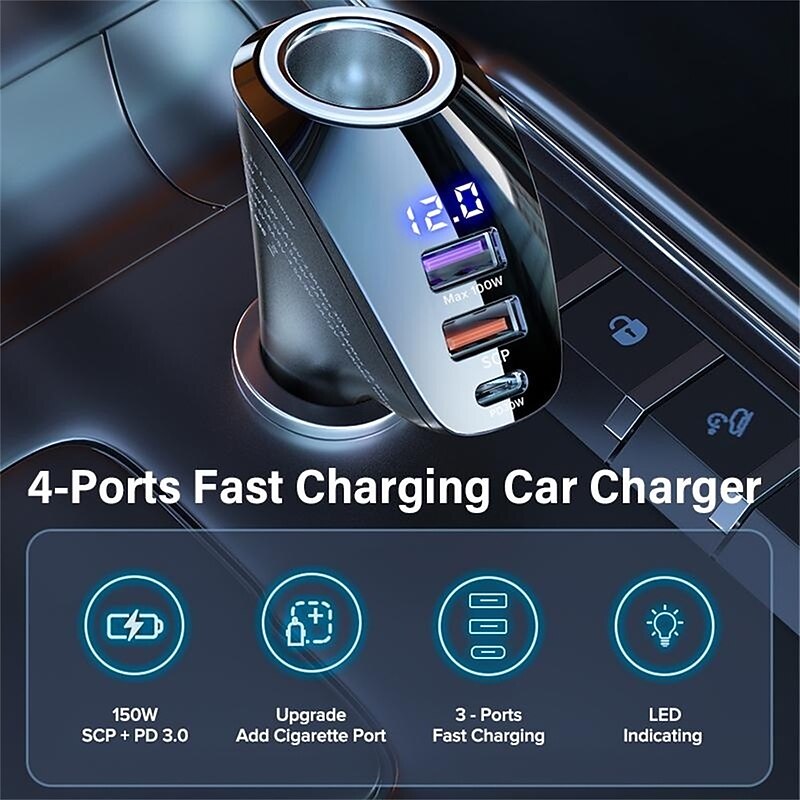 150W Car Charger - USB Type C Super rapid Charging, PD 4.0 & hasty Charge 3.0, Cigarette Lighter Socket