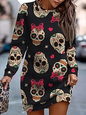 More information about Halloween Women's Skulls Print Mini Dress Casual Dress Shift Dress Casual Regular Fit Graphic Skull Long Sleeve Crew Neck Black Spring Fall Winter