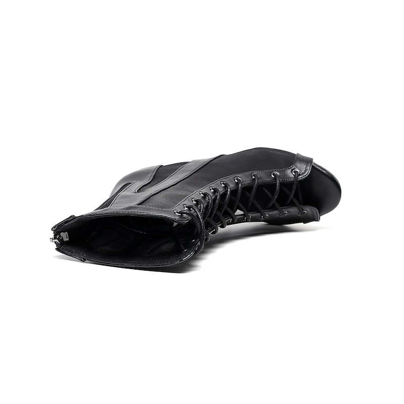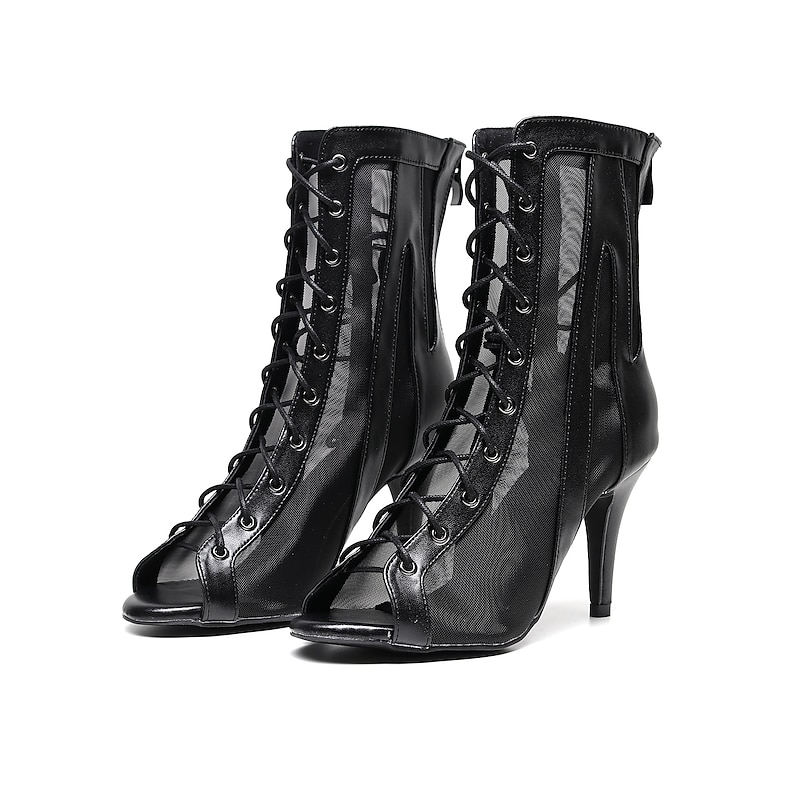 Highlights [Fabric and Material] : Crafted from a combination of faux leather and mesh materials, these Women's Dance Boots provide a chic and modern aesthetic. The incorporation of tulle adds a touch of elegance, offering both breathability and stunning visual appeal. [Style and Fit] : Featuring a slim high heel design, these boots boast a sleek silhouette that complements various dance styles. The lace-up detail allows for an adjustable fit, offering both comfort and secure hold, while the peep-toe front showcases a sophisticated pedicure. [Design Highlights] : The open-toe style and high ankle cut add elegance, while the lace-up embellishment with splicing details enhances the modern design. The stiletto heel elevates your look, making these boots ideal for all occasions, from casual to formal events. [Occasions] : Perfect for performance, training, and parties, these dance boots are versatile and stylish. Whether you're attending a ballroom event or hitting the dance floor at a party, the sleek black color complements various outfits seamlessly. [Size Range] : Available in a wide range of sizes from 33 to 43, ensuring a perfect fit for every dancer. The standard size suggestion allows you to select your usual size with confidence. Perfect for everyday use. first-class materials and excellent craftsmanship ensure long-lasting durability.