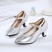 Highlights [Fabric] : Crafted with a shiny metallic upper material resembling a subtle snakeskin pattern, these Women's Silver Glitter Ballroom Dance Shoes offer both elegance and durability. The inner lining made from soft fabric provides exceptional comfort, ensuring a gentle, snug fit throughout extended dance sessions. [Fit] : Featuring a classic Mary Jane style with a closed-toe design, these shoes deliver a blend of timeless sophistication and modern charm. The generous toe space enhances comfort, making them perfect for long evenings of dancing. [Design Highlights] : The secure adjustable buckle strap across the instep not only enhances the fit but also adds a sleek element to the overall look. The mid-height block Cuban heel, approximately 4 cm, offers a stable lift, allowing for graceful movements on the dance floor. [Occasions] : Perfectly suited for ballroom dance events, proms, foxtrot, and other formal occasions, these shoes seamlessly complement both elegant dresses and more casual ensembles. Their versatile design makes them an excellent addition to any dancer's wardrobe. [Size Notice] : Available in a range of sizes from US5 to US10.5, these heels are designed with a standard fit. For those with wider feet, it is recommended to select one size up for optimum comfort. Perfect for everyday use. excellent materials and excellent craftsmanship ensure long-lasting durability.
