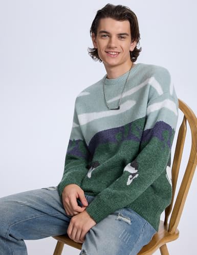 Kissonic Mens Vintage Oversized Sweater Cow Long Sleeve Crew Neck Knitted Grassland Pullover Jumper Unisex Tops