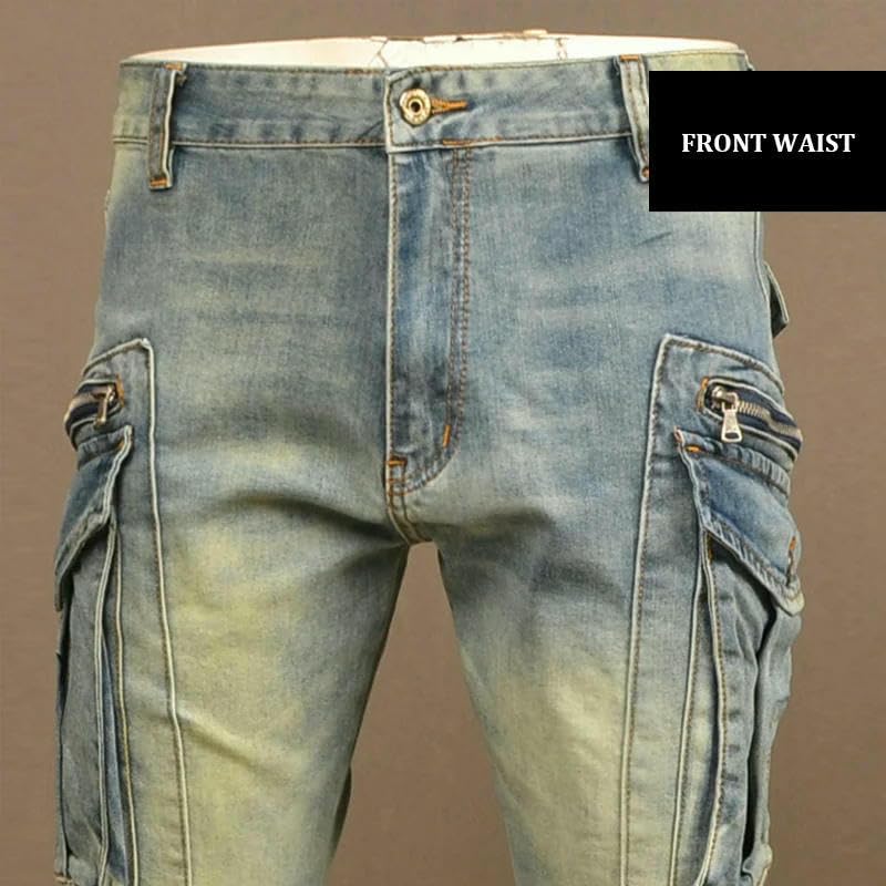 popular ! Street Mens Jeans Retro Washed Blue Stretch Slim Fit Spliced Biker Jeans Men Pocket Hip Hop Denim Cargo Pants
