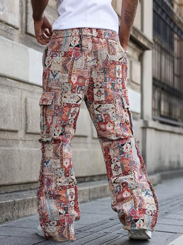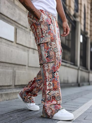 Men's Vintage Bohemian Straight Leg Pants Drawstring Belt Pocket Tassel Leg distinctive Style Daily Travel Casual Pants Streetwear