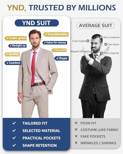 • OUTSTANDING QUALITY AND CRAFTSMANSHIP: Each YND suit or tuxedo embodies unparalleled excellence from material selection to final production. We meticulously choose premium fabrics, prioritizing comfort and durability. Through meticulous stitching, expert tailoring, and acute attention to detail, each suit undergoes an extensive process of over 300 steps, making a precise match to its visual representation.
