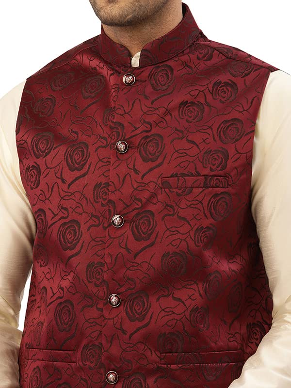 • Crafted in premium polyester brocade fabric, this Indian Waistcoat for Men features a detailed floral pattern, a crisp mandarin collar, button placket, and three practical pockets for a polished yet functional silhouette.