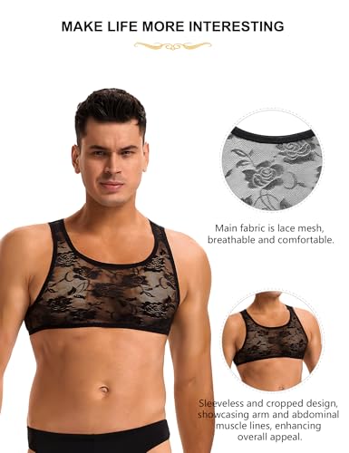 • MATERIAL: 88% Nylon + 12 % Spandex.This men's lingerie is made of supple lace fabric, breathable and elastic, sleeveless design highlights the shoulders and arms, revealing design allows you to release unlimited manly charms, or as a sissy crossdress lingerie for your sepical lover.