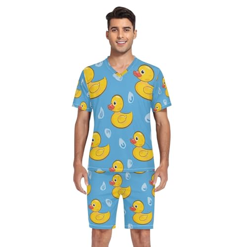 Men's Pajama Set Yellow Ducks Blue Background Short Sleeve with Shorts Pockets Sleepwear Set Summer Loungewear