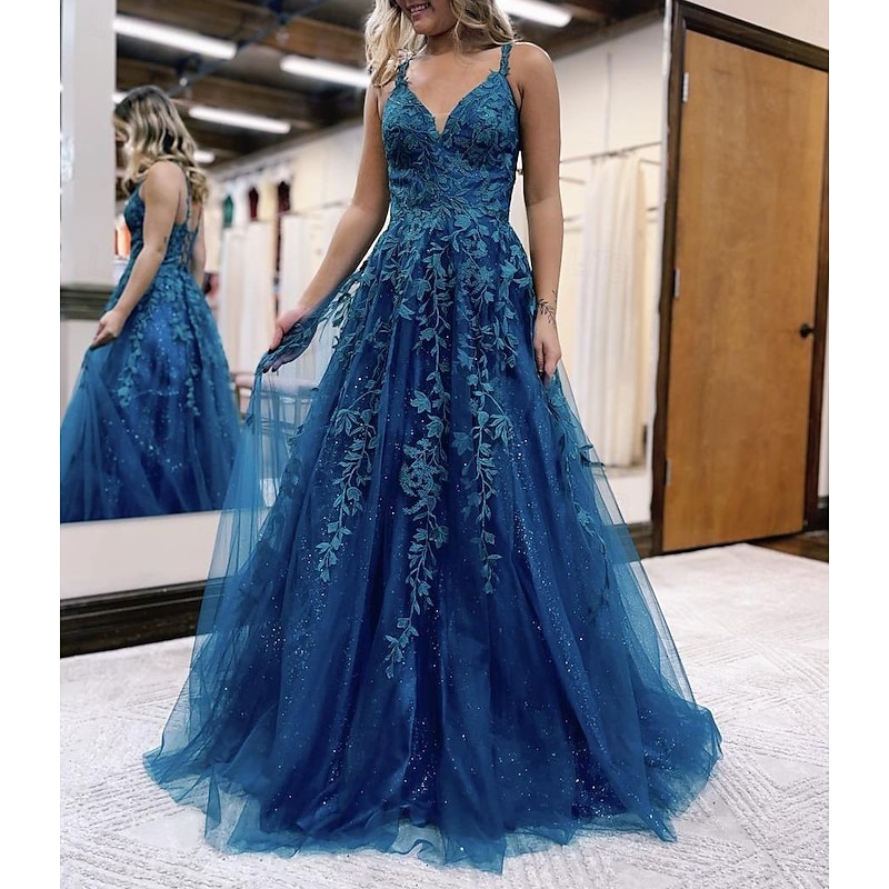 Highlights [Fabric] This exquisite gown is crafted from luxurious layers of tulle, providing a voluminous and airy A-line silhouette that flatters any figure. The fabric is delicately adorned with appliques and a sprinkling of glitter, adding a subtle sparkle that enhances its allure. [Silhouette] Designed in a classic A-line ball gown style, this dress offers a floor-length hemline that exudes elegance and sophistication. The built-in bra provides additional support while maintaining a sleek, smooth fit. [Design Highlights] The gown showcases a captivating V-neckline paired with a backless design, detailed with intricate floral appliques that add a touch of sophistication. The sleeveless style with delicate spaghetti straps enhances its feminine charm. [Occasions] Perfect for weddings, formal parties, and prom nights, this gown offers a captivating presence, making it a standout choice for any special occasion. Whether you're attending a wedding or a formal event, this dress is designed to impress. [Size Range] Available in a comprehensive range of sizes from US 0 to US 26W, including custom measurements. This ensures a perfect fit for every body type.