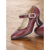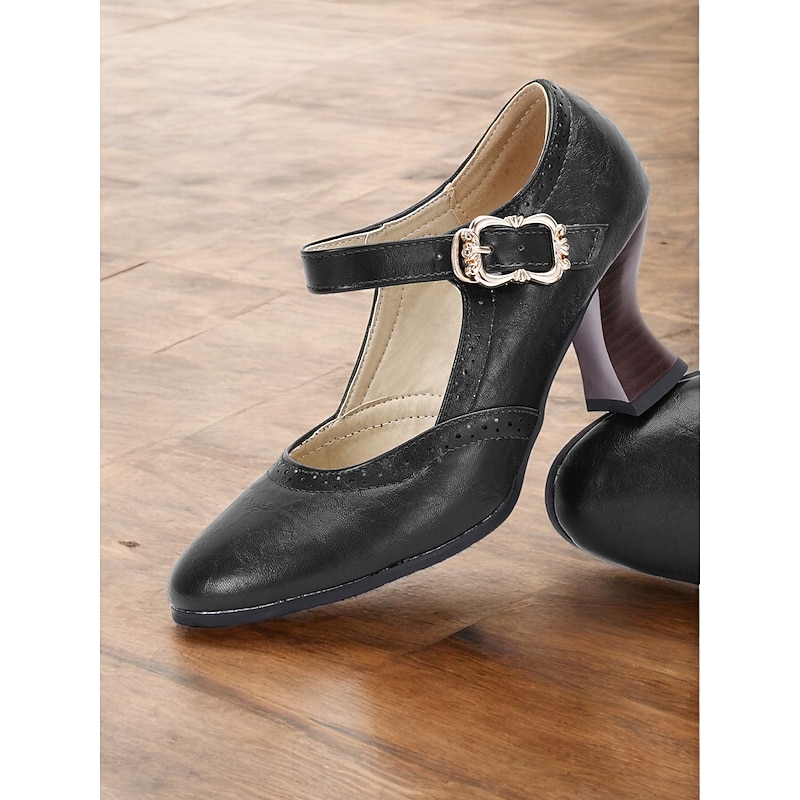 Highlights [Fabric] : Crafted from high-quality PU with a synthetic leather lining, these women's pumps offer a sleek and durable finish. The material features intricate brogue detailing that adds a touch of sophistication and highlights the vintage-inspired design. The rubber outsole provides excellent grip and durability, making them suitable for everyday wear. [Fit] : Designed in a classic Mary Jane style, these pumps feature a secure buckle closure and an adjustable strap for a customizable fit. The rounded toe shape ensures comfort, while the sculptural heel provides a stable base, making them ideal for long hours of wear. [Design Highlights] : These pumps exude elegance with their vintage appeal, featuring fine stitching and subtle perforated detailing. The decorative metal buckle enhances the aesthetic, and the slight platform at the toe area adds both style and additional comfort. [Occasions] : Perfect for parties, daily wear, and work settings. Whether you're heading to an office meeting or a formal event, these pumps complement a variety of outfits, enhancing your retro-style appearance with elegance and charm. [Size Information] : Available in a range of sizes from US5/EU35/UK3 to US13/EU43/UK11, with a standard size fit suggestion. Select your usual size for a comfortable and accurate fit.