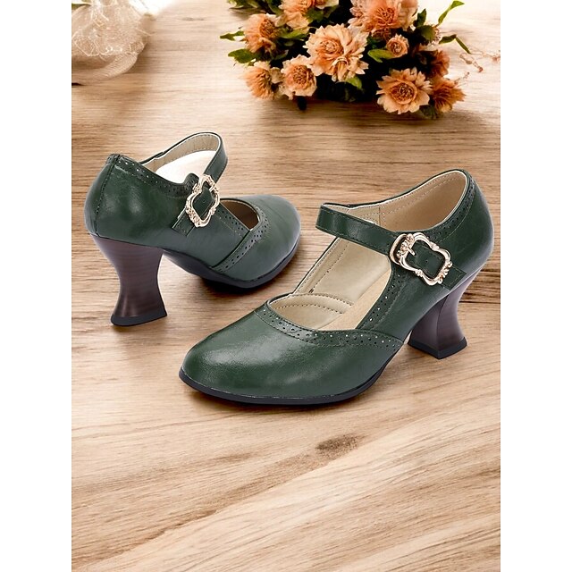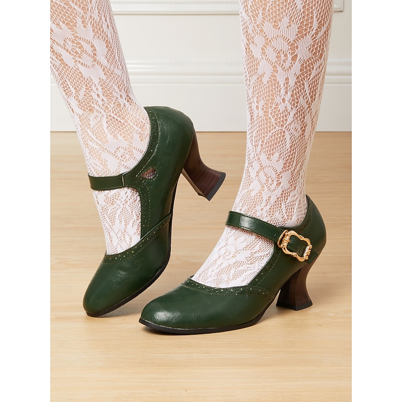 Women's Vintage Gatsby Green faux Leather Mary Jane Pumps for  Mid-Heel Dress Shoes with Brogue Detailing and Buckle Strap, Ideal for Office, Formal Events, and Retro Style Outfits 20