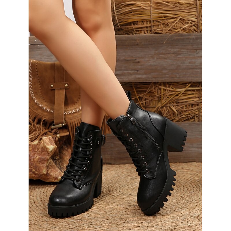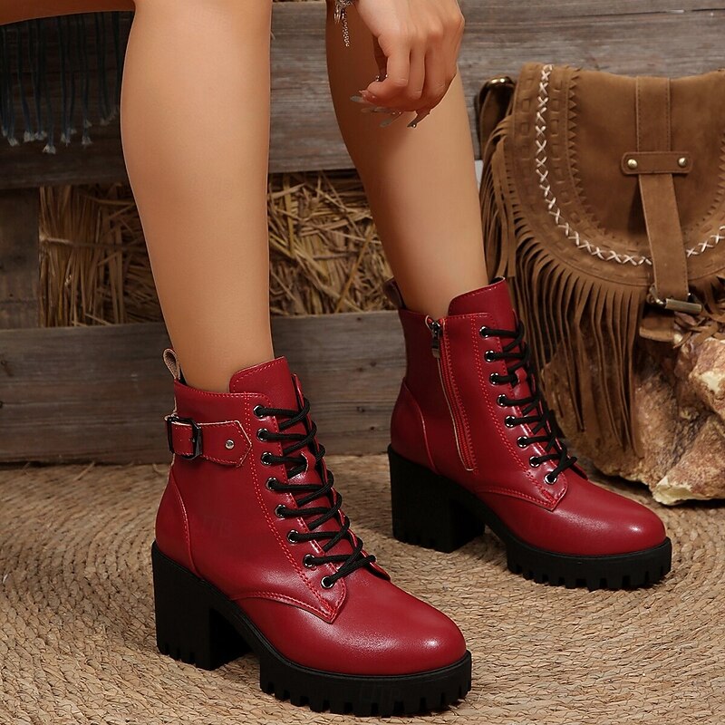 HOT ! Red Faux Leather Lace-Up Ankle Boots for Women – Chunky Block Heels with Zipper and Buckle Detail, Trendy and Durable Outdoor Boots