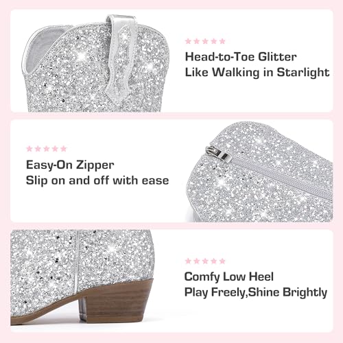 • Dazzling Glitter Design:Your little star will love these girls glitter boots! Featuring a radiant all-over sparkle finish and chic pointed toe,these girls sparkle cowgirl boots are ideal for parties and performances.The low block heel adds a touch of elegance while keeping her steady