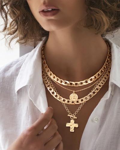MJartoria Gold Layered Necklaces for Women Trendy Retro Coin and Cross Pendant Necklace Dainty Chunky Chain Necklaces for Jewelry Birthday Gifts 1
