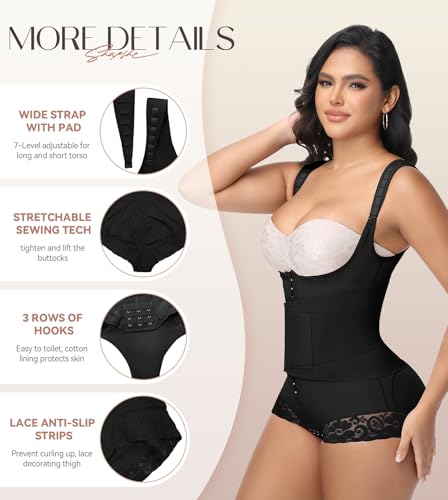 • MORE HUMANIZED DETAILS: The 8-level adjustable padded shoulder strap is suitable for women with long and short torsos. 3 rows of hooks at the crotch make it convenient to use the toilet. The pure cotton lining at the crotch protects the skin of the private parts. The anti-slip strips on the thigh prevents curling. The stretchable sewing tech of hip lifts the buttocks and helps to create an S-shaped curve