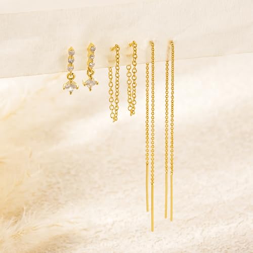 • DAINTY EARRINGS SET: Set contains: CZ stud earrings, dangle chain earrings, threader earrings. These handmade earrings have a trendy and delicate design. Our fashion earrings accessories are perfect for your daily life, adding elegance and charm