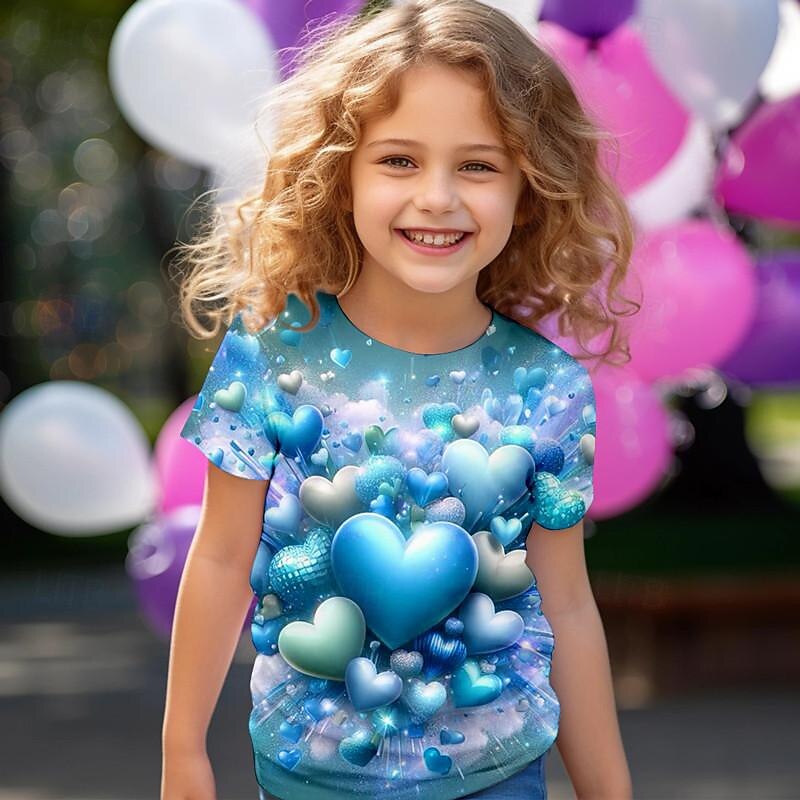 HOT ! Valentines Girls' 3D Heart Tee Shirt Pink Short Sleeve 3D Print Summer Active Fashion Cute Polyester Kids 3-12 Years Crew Neck Outdoor Casual Daily Regular Fit
