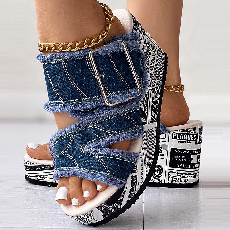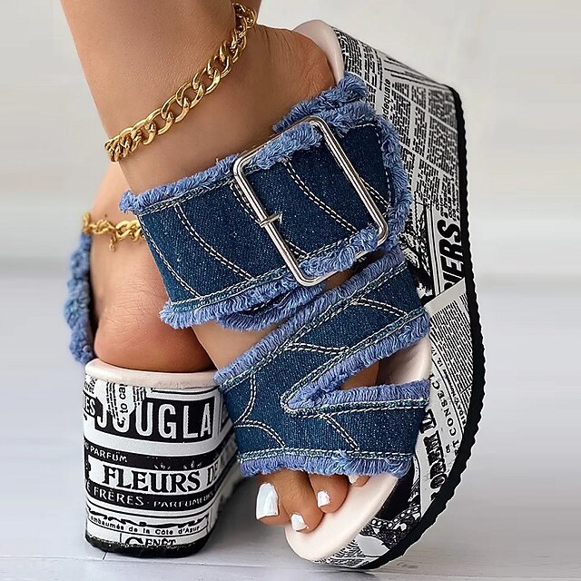 Highlights [Fabric] : Crafted from durable canvas fabric, these women's wedge sandals are designed for the summer season. The material offers both comfort and resilience, perfect for daily wear. [Silhouette] : The sandals feature a modern wedge heel, ranging from one to two inches in height, and an open toe design, making them an ideal choice for casual outings and beach days. [Design Highlights] : The standout wedge platform boasts a unique newspaper print design, giving the sandals a distinctive flair. Wide denim straps with prominent white stitching and a large silver-tone buckle add an edgy and bold accent, adjustable for a secure fit. [Occasions] : These casual canvas sandals are perfect for outdoor activities, daily errands, and laid-back summer gatherings. Their trendy style makes them suitable for both beach walks and urban adventures. [Size Range] : Available in a variety of sizes, these sandals cater to different preferences, ranging from US5.5 / EU35 / UK3.5 to US10.5 / EU42 / UK8.5, ensuring a comfortable fit for many wearers.