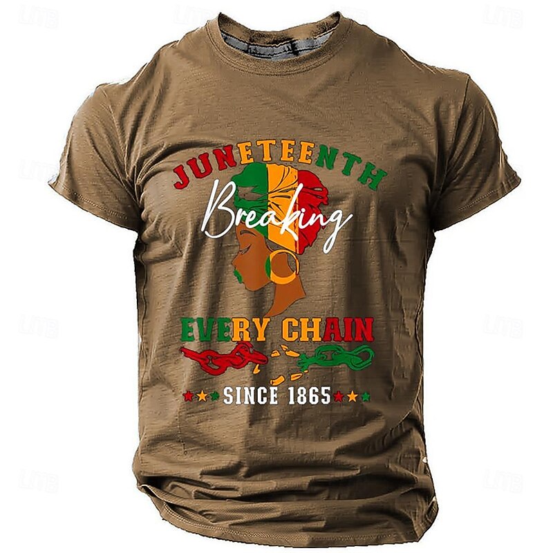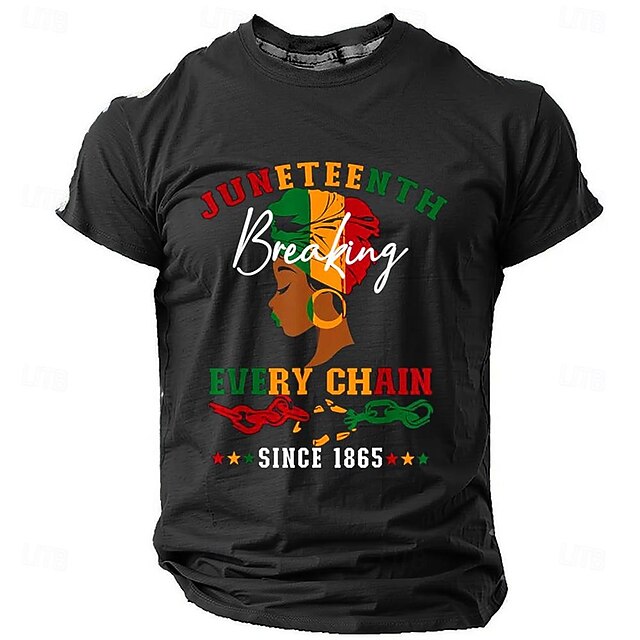 : Featuring a striking 3D print of tribal African patterns, this T-shirt celebrates Juneteenth with text graphics such as “Juneteenth Breaking Every Chain” and a vibrant depiction of cultural symbols. The black base contrasts with the vivid colors of red, green, and yellow, while the illustration of a woman with a colorful headwrap and hoop earrings adds cultural depth and allure.