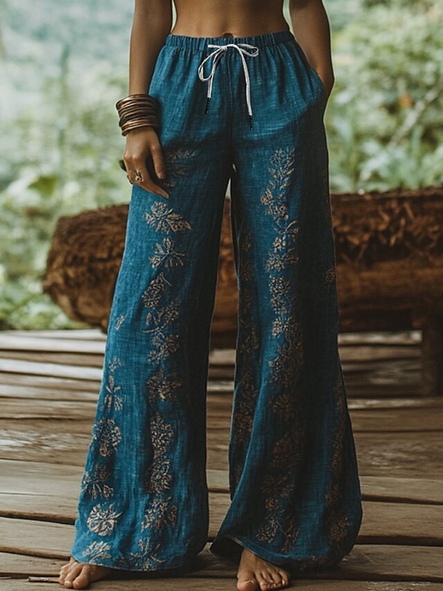 More information about Women's Wide Leg Chinos Baggy Pants Vacation Vintage Ethnic Style Full Length High Waist Floral Graphic Printing Thermal Warm Soft Breathable Micro-elastic Vacation Street Causal Sky Blue And White
