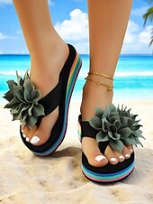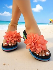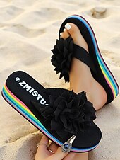 More information about Women's Rainbow Platform Flip Flops with Large Pink Flower, Colorful Beach Sandals for Vacation, Teens and Young Adults, Summer Casual Style