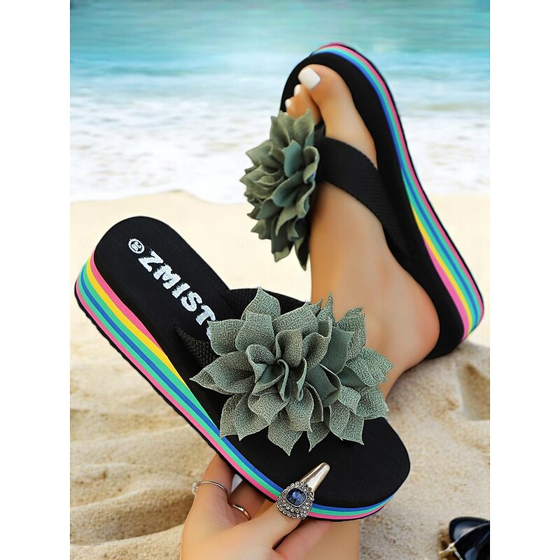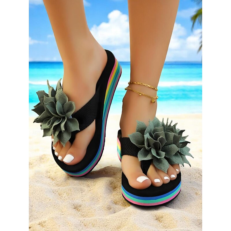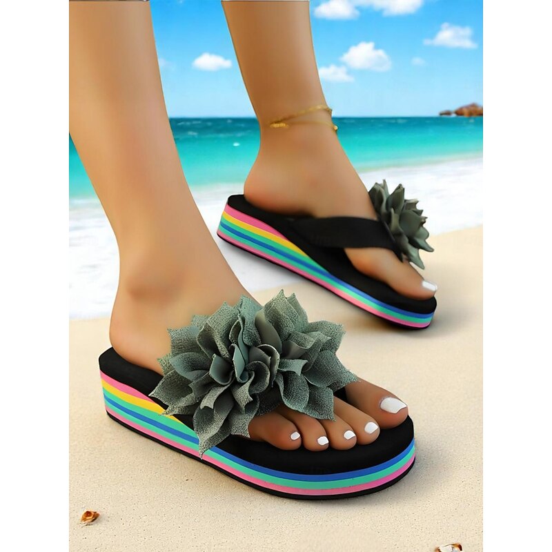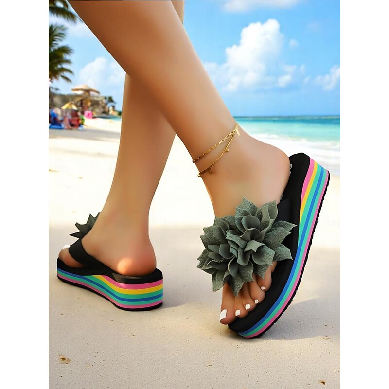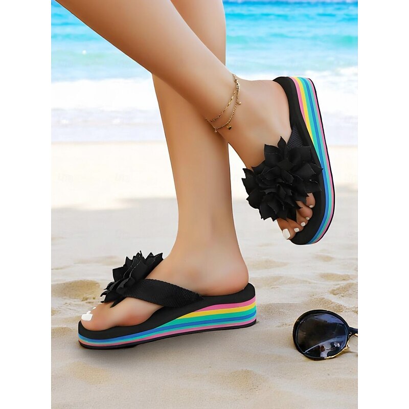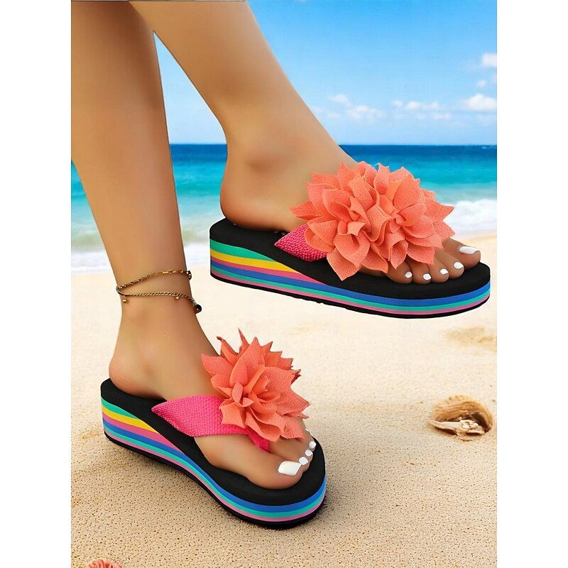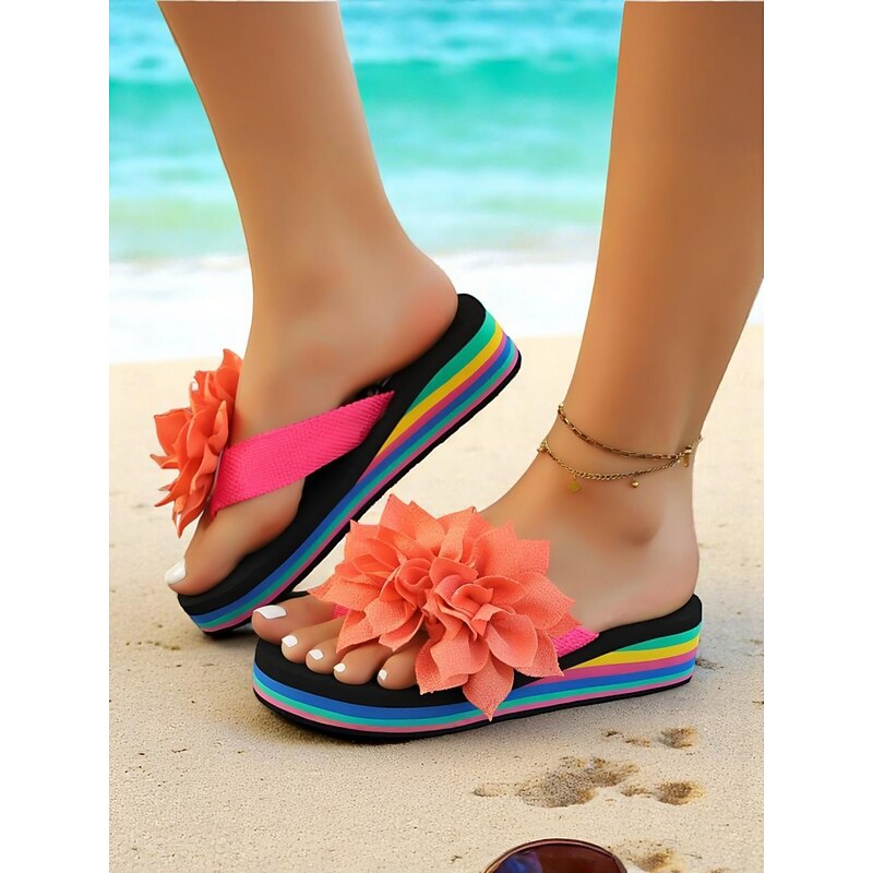 HOT ! Women's Rainbow Platform Flip Flops with Large Pink Flower, Colorful Beach Sandals for Vacation, Teens and Young Adults, Summer Casual Style