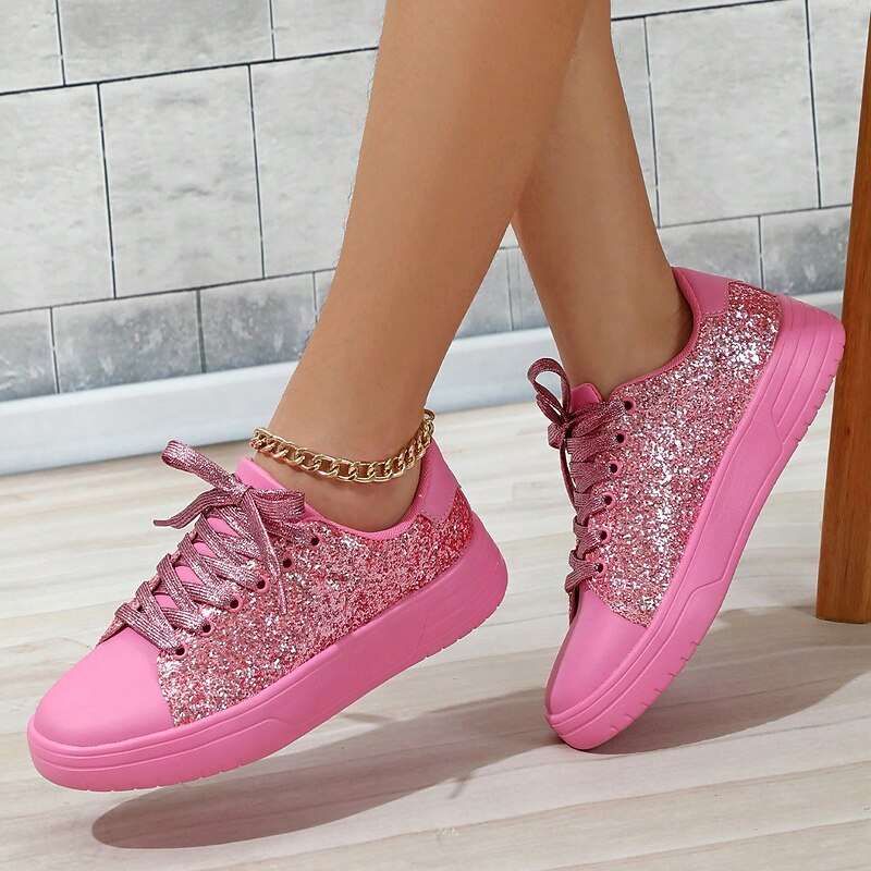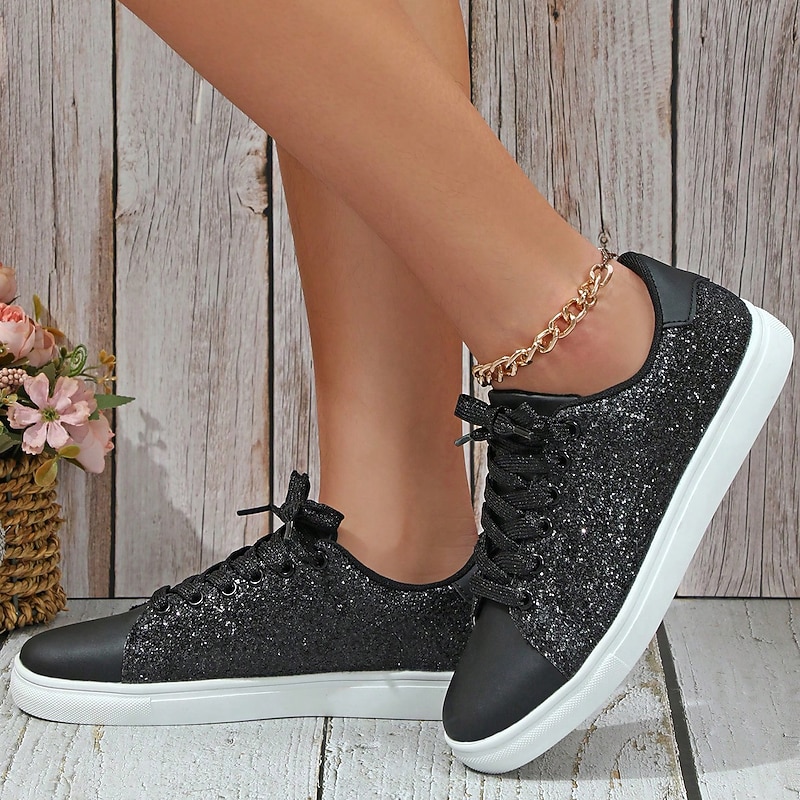 : Crafted with high-quality PU material, these women's sneakers feature an upper adorned with shimmering silver glitter fabric, ensuring a standout, eye-catching look. The interior is lined with a soft, comfortable material, making them ideal for all-day wear.
