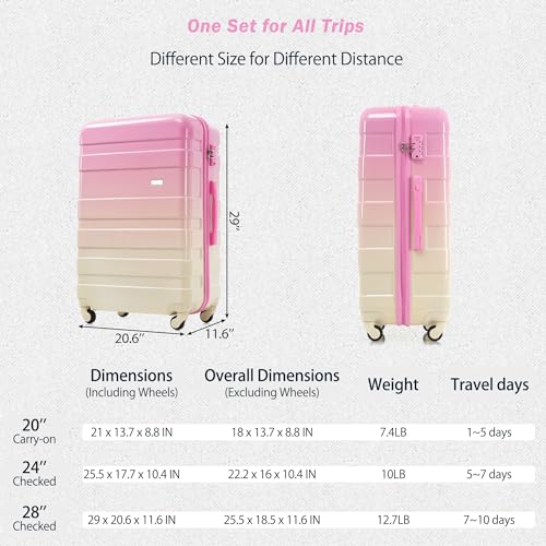 Luggage Sets New Model ABS Hardshell 3pcs Luggage Hardside Lightweight Durable Suitcase sets Spinner Wheels Suitcase with TSA Lock 20''24''28''(Pink) 3