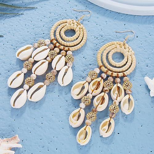 BOCAR Statement Boho Rattan Shell Dangle Earrings for Women Handmade Summer Vocation Beach Tropical Accessories Jewelry Gift (ER-1013-Beige) 6