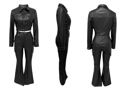 Tbahhir 2 Piece Sexy Leather Outfits for Women Slim Fit Sets Long Sleeve Crop Top and High Waist Flare Pants with Pockets 1