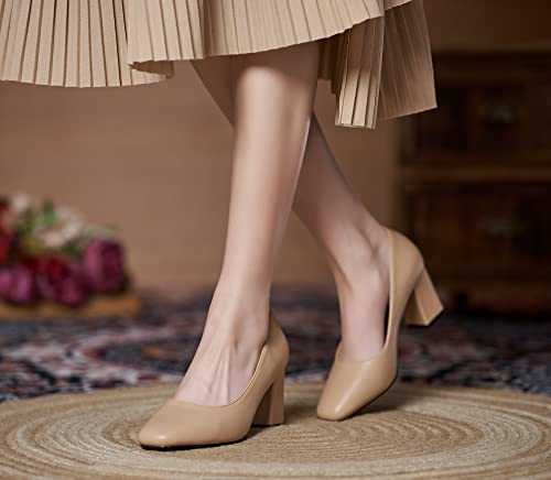 YooPrettyz Women Office Leather Pump Shoe Daily Wear Work Pump Block Heel Square Toe Polished Mid Heels 6
