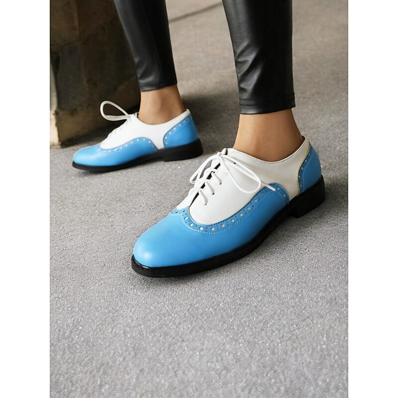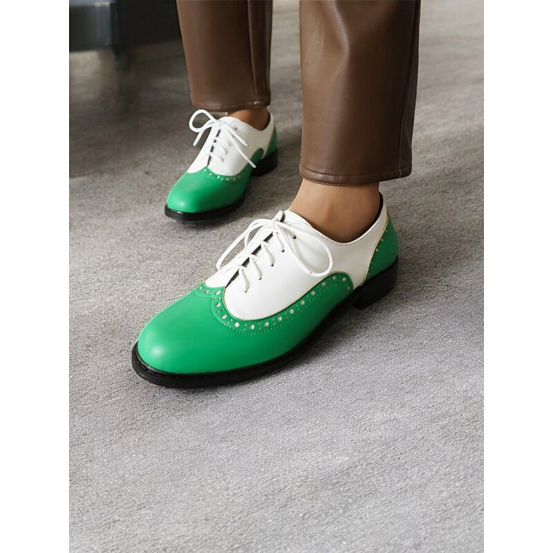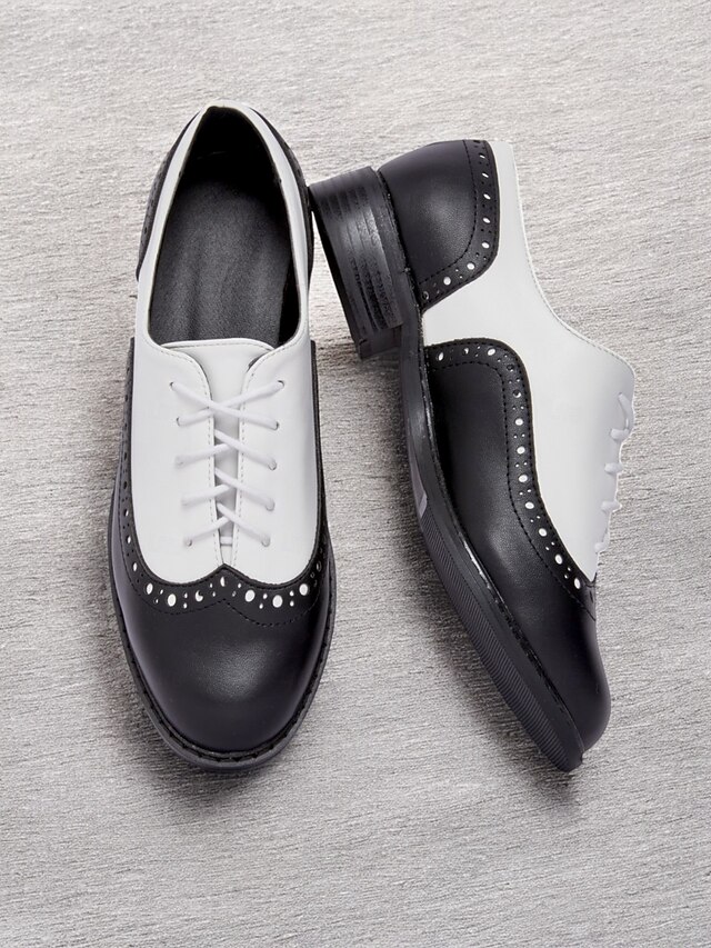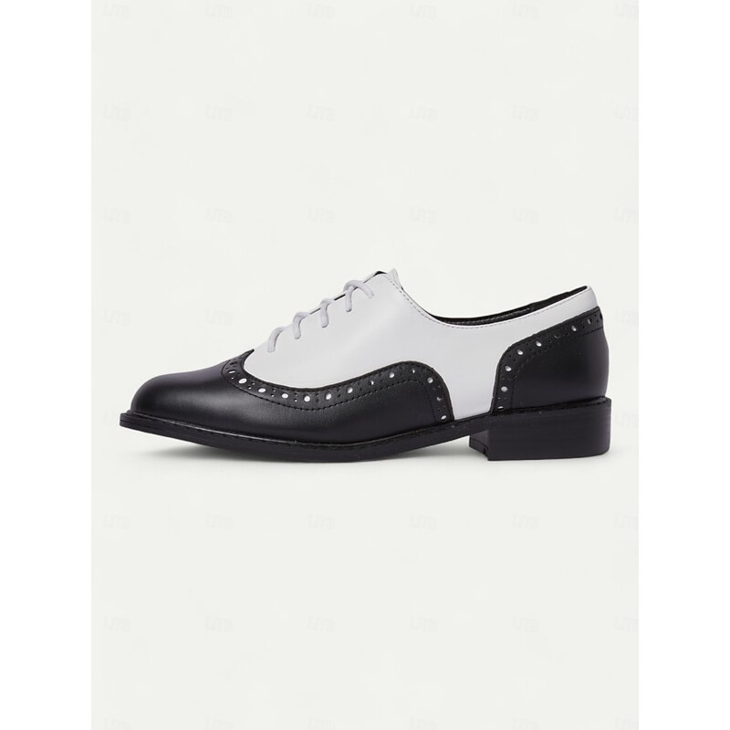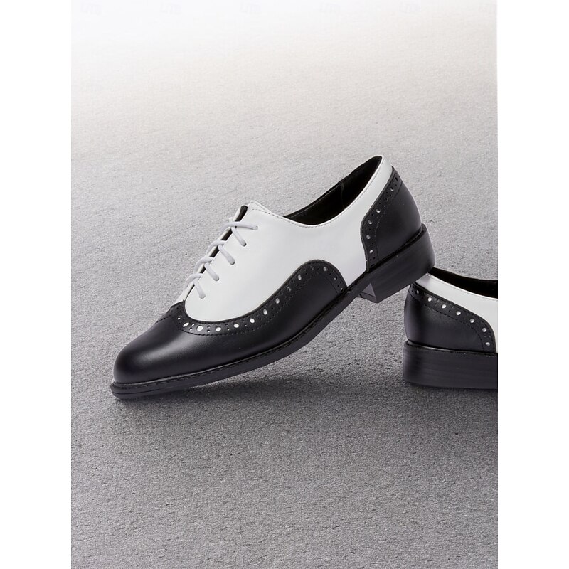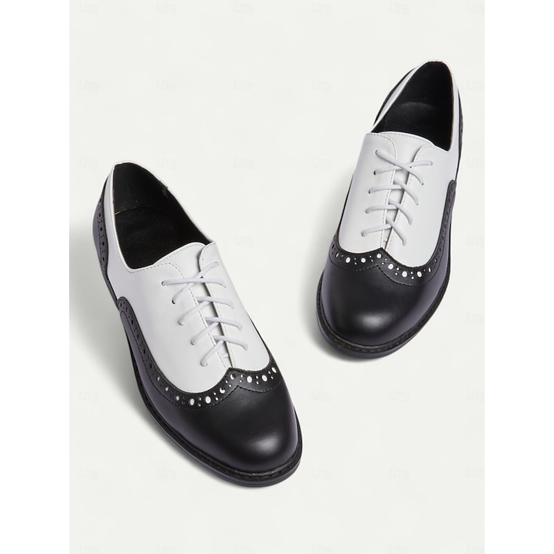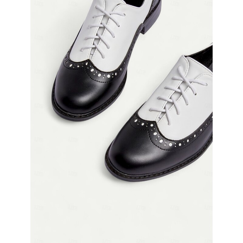 Highlights [Fabric] : Crafted from premium PU for the upper and lined with synthetic leather, these oxford shoes offer durability and a polished appearance, perfect for year-round wear in spring, summer, fall, and winter. [Style] : These classic brogue oxford shoes feature a sophisticated two-tone design in sleek black and crisp white, combining elegance with versatility. The chunky heel ensures all-day comfort and support. [Design Highlights] : The brogue detailing with decorative perforations along the seams adds an elegant touch to these timeless oxfords. The round toe design and color block pattern enhance their classic appeal, while the lace-up closure guarantees a secure fit. [Occasions] : Ideal for both daily and work settings, these shoes effortlessly transition from formal events to smart-casual gatherings. Their versatile style makes them suitable for a variety of occasions, adding a refined finish to any outfit. [Size Notice] : Available in a range of sizes from US5.5/EU35/UK3.5 to US10.5/EU42/UK8.5, these shoes are designed to accommodate standard sizing. It is recommended to select your usual size for the perfect fit.