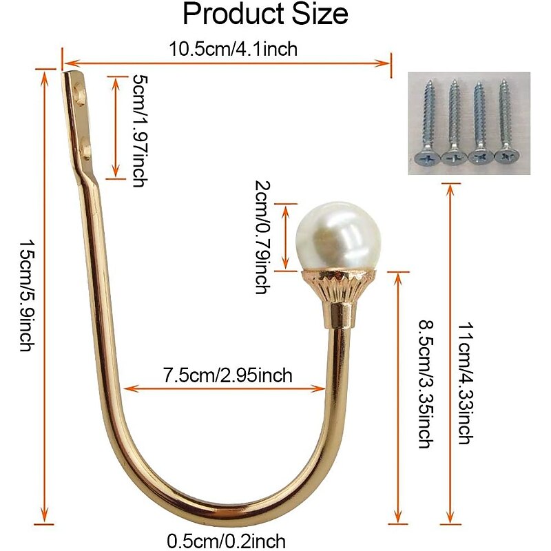 Pearl curtain tiebacks fit for most of Curtains:Hook height: 5.9inch/15cm,hook width: 2.95inch/7.5cm.This size is suitable for thick or heavy curtains, no straps needed. Easily holdback or release curtain on both sides of the window. The U-shaped curtain tieback hooks adopts a double-hole design to reinforce the load-bearing capacity, not easy to fall, and the load-bearing is stronger.