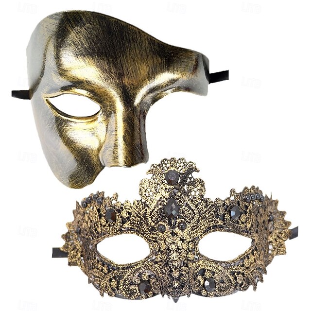 Highlights [Fabric] : Crafted from durable and high-quality plastics, these masks are designed to withstand multiple uses while maintaining their exquisite appearance. The upper mask features a metallic gold finish that adds a touch of vintage elegance, while the lower mask is adorned with intricate lace and black rhinestones for added glamour. [Fit] : Both masks are unisex and feature a half-face design, suitable for a wide range of face shapes. The adjustable black ribbons ensure a secure and comfortable fit, accommodating various head sizes with ease. [Design Highlights] : The upper mask boasts a Venetian-inspired look, covering the right side of the face with a classic asymmetrical design that evokes traditional opera aesthetics. The lower mask is beautifully crafted with lace featuring ornate floral and leaf motifs, providing a luxurious and sophisticated effect. [Occasions] : These masks are perfect for a variety of events, including masquerade balls, costume parties, theatrical performances, and Carnival celebrations. Their blend of mystery and elegance makes them ideal for both festive and formal occasions. [Size Notice] : Suitable for adult wearers, the masks are designed for comfort and easy adjustment, ensuring they fit most head sizes comfortably. Perfect for everyday use. first-class materials and excellent craftsmanship ensure long-lasting durability.