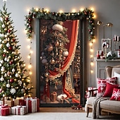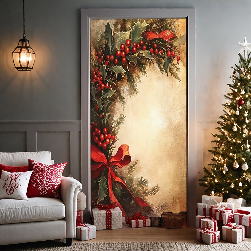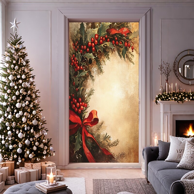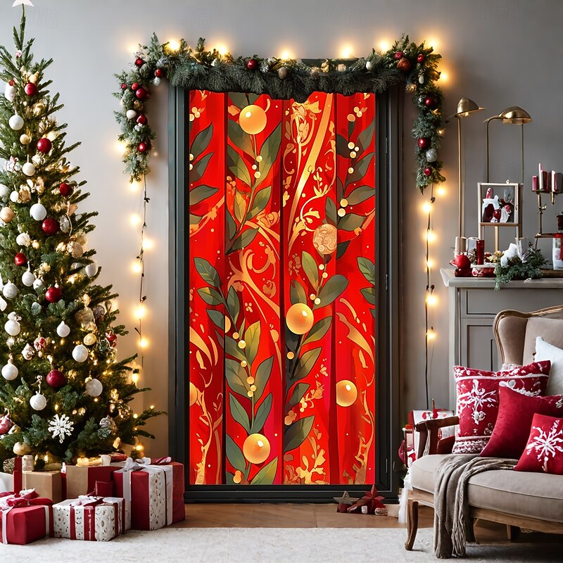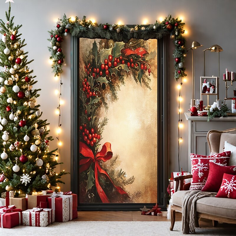 Christmas Door Decorations Door Covers Evergreen Holly Door Tapestry Door Curtain Decoration Backdrop Door Banner for Front Door Farmhouse Christmas Holiday Party Decor Supplies Gift Indoor/Outdoor 18