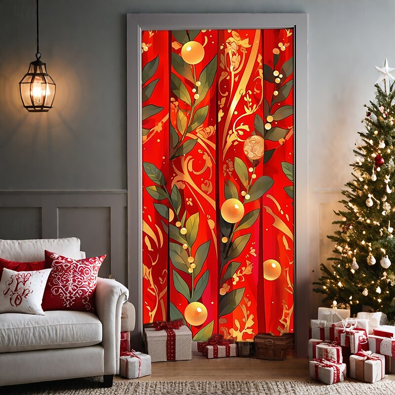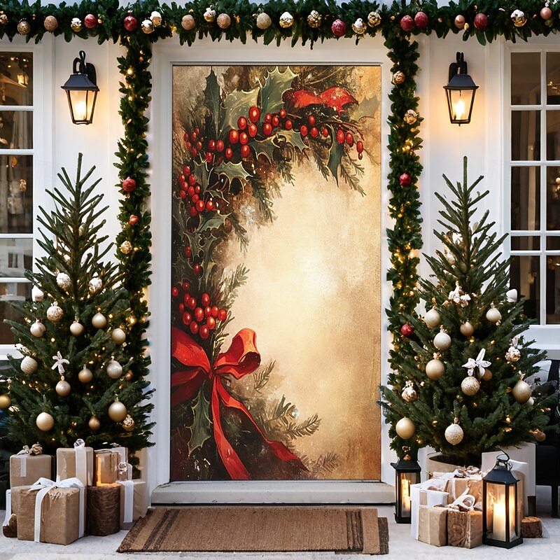 Christmas Door Decorations Door Covers Evergreen Holly Door Tapestry Door Curtain Decoration Backdrop Door Banner for Front Door Farmhouse Christmas Holiday Party Decor Supplies Gift Indoor/Outdoor 1