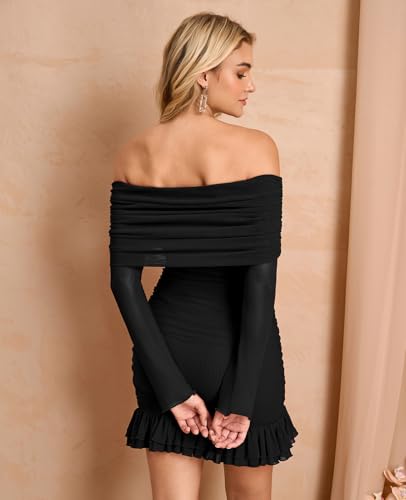 • Design:Designed with flattering ruching throughout the body, this ruched bodycon dress for women sculpts your curves for a sexy, form-fitting mini dress look that turns heads.The elegant long sleeves add sophistication, balancing the exposed shoulders for a captivating look suitable for parties or date nights