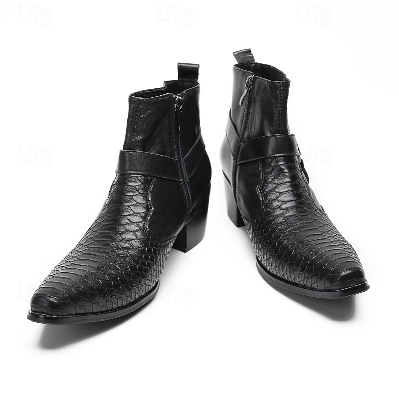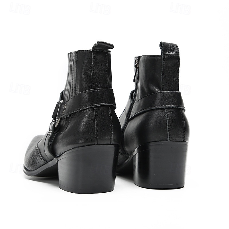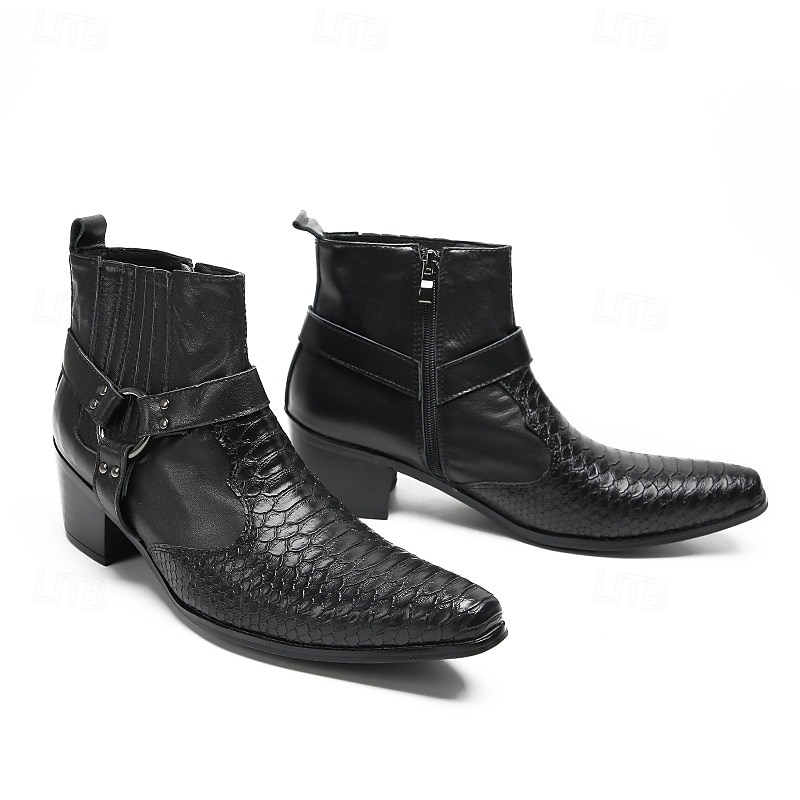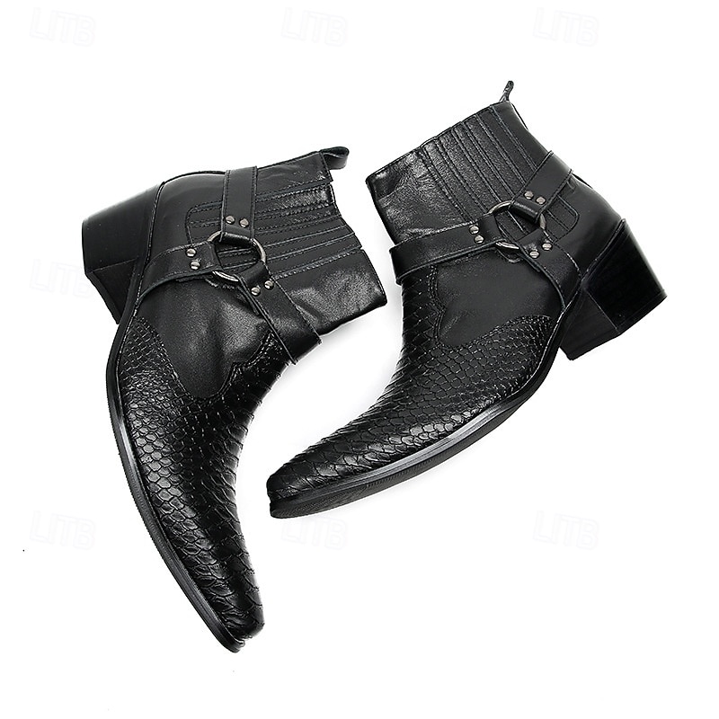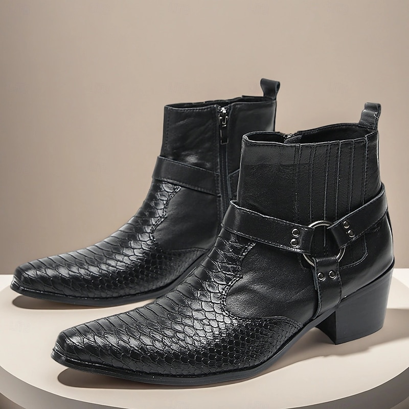 More information about Men's Black Genuine Leather Harness Boots with Crocodile Pattern and Block Heel, Cowhide Motorcycle Cowboy Boots for Stage, Club and Gothic Fashion
