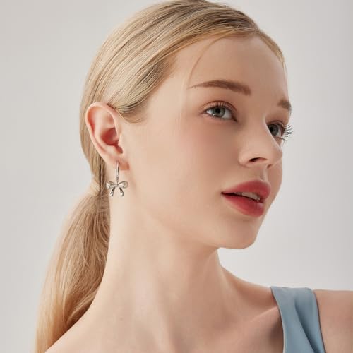 Bow Earrings for Women Lightweight Hypoallergenic Silver/Gold Bow Dangle Huggies Earrings for Women Trendy Jewellery Gift 6
