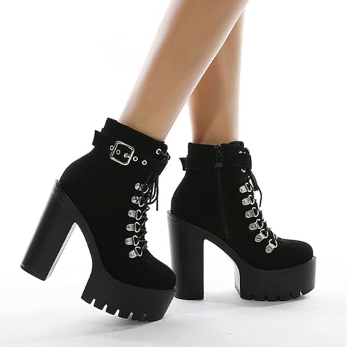 HOT ! Women's Chunky Heel Platform Goth Dress Ankle Boots Classic Round Toe Lace Up Side Zipper High Block Heel Combat Bootie