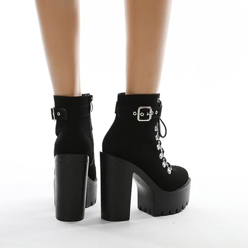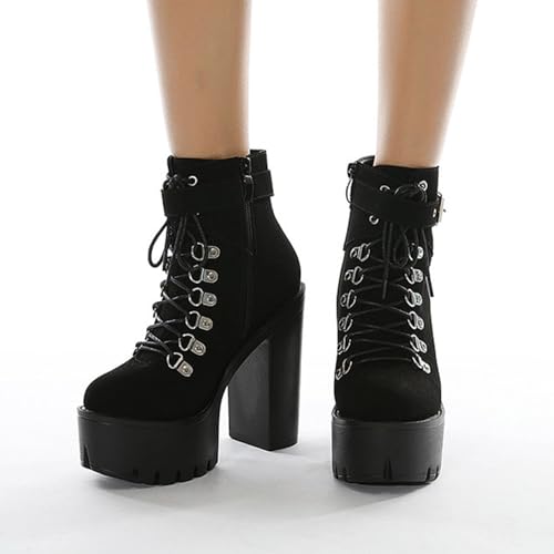 Women's Chunky Heel Platform Goth Dress Ankle Boots Classic Round Toe Lace Up Side Zipper High Block Heel Combat Bootie 4