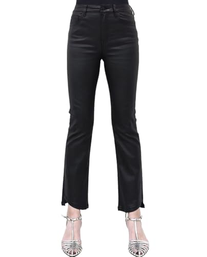 • Vervet by Flying Monkey Jeans | Comfort stretch jet black glossy coated flare jeans | High rise waist | Ankle to cropped length with step hem detail | Has 5 pockets | Front zip and button closure | Unlined