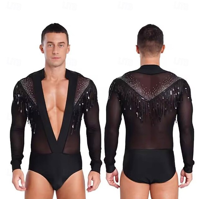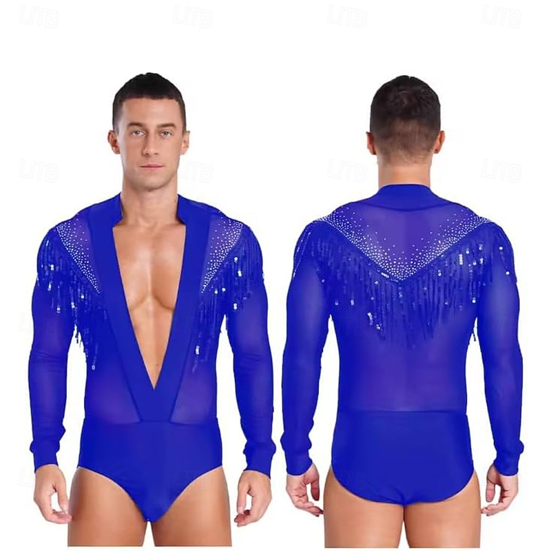 Mens Sheer Mesh Bodysuit Tango Latin Dance Leotard Deep V-neck Figure Skating Dance Costume 1
