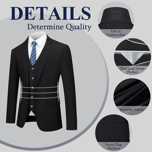 • 3 Pieces Men Suit Set:Designed in Italy,package of this dress suit set insludes jacket + pants + vest + tie.Jacket features single breasted 2-button closure, notched lapel, chest pocket for handkerchief, two flap pockets, four cuff buttons each side. Vest features V-neck design,5 buttons. Pants have flat front, stretchy waist, invisible zipper,2 real back pocket.