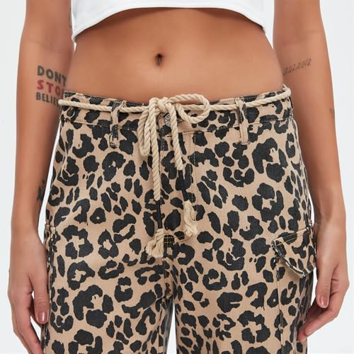 Distressed Baggy Jeans for Woman Leopard Mid Waist Wide Leg Denim Cargo Pants with Pockets Drawstring 5