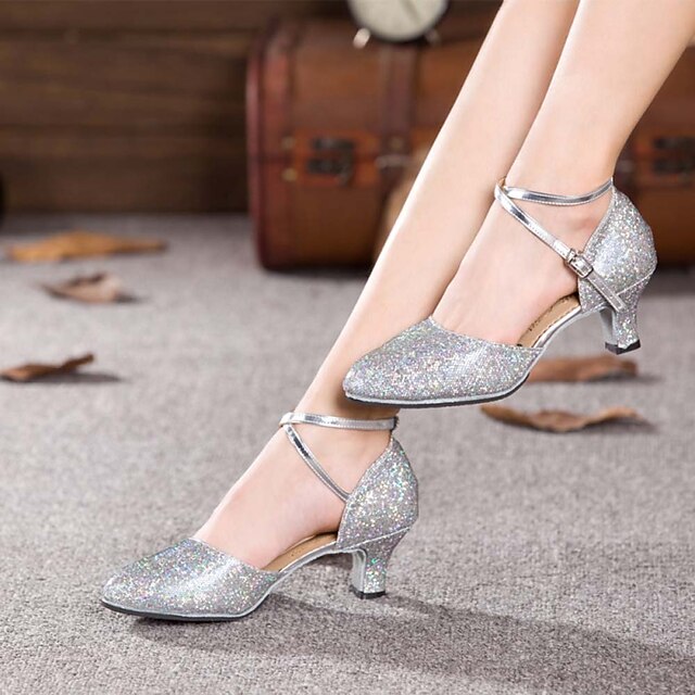 Women's Silver Glitter Ballroom Dance Shoes with Ankle Strap – Sparkly Mid-Heel Latin Salsa Party Shoes for Weddings & Special Occasions