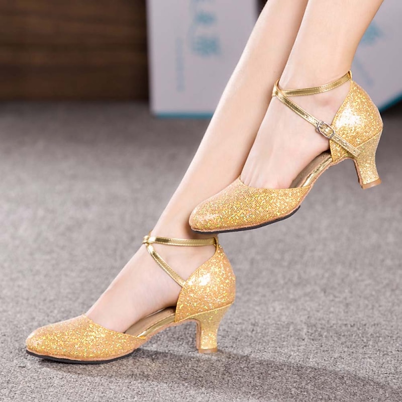 : Crafted with a sparkling glitter upper adorned with paillettes and synthetic materials, these ballroom dance shoes ensure both a glamorous visual appeal and durability. The interior is lined with soft leatherette, providing comfort throughout wear, while the suede outsole offers a smooth glide across dance floors.