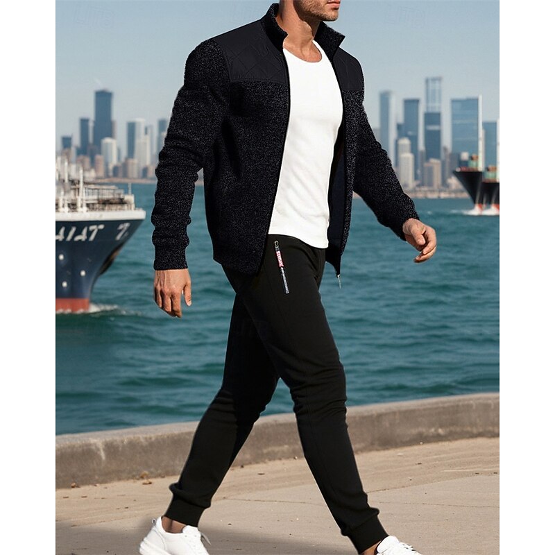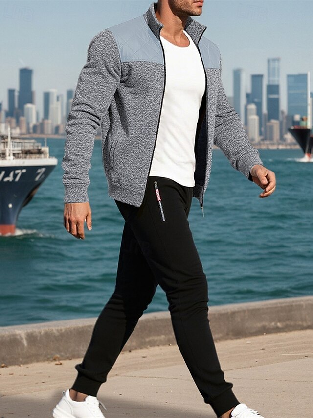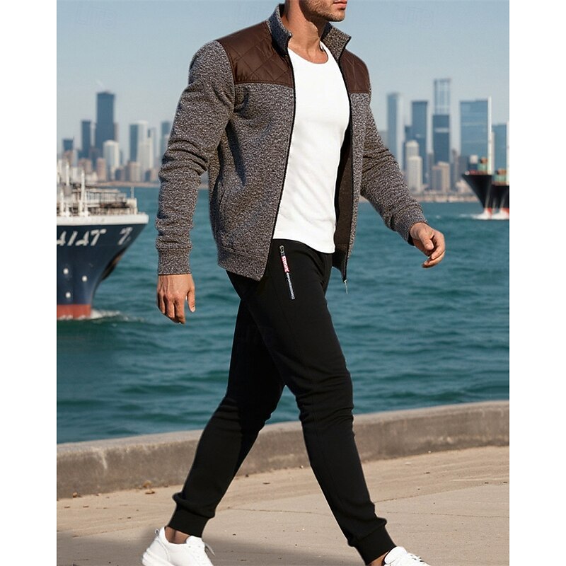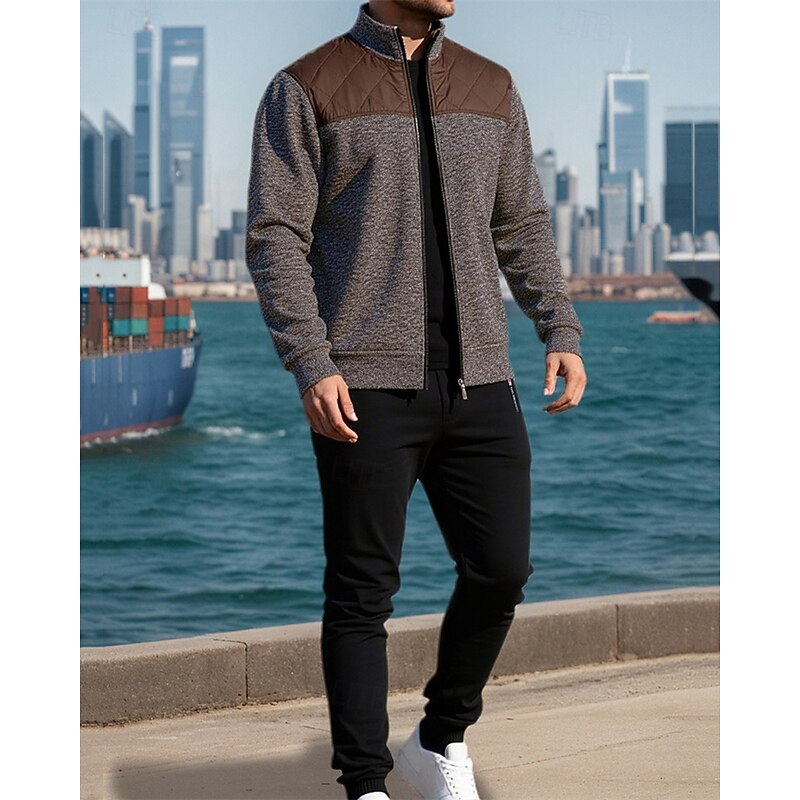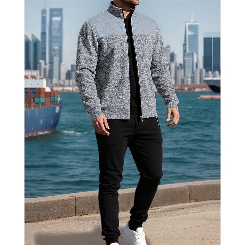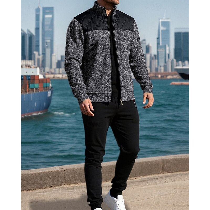 HOT ! Men's Casual Jacket Set Vacation Daily Breathability Pocket 2 Piece Spring Fall Color Block Fashion Classic Stand Collar Regular Black Wine Navy Blue Light Grey Dark Gray Jacket