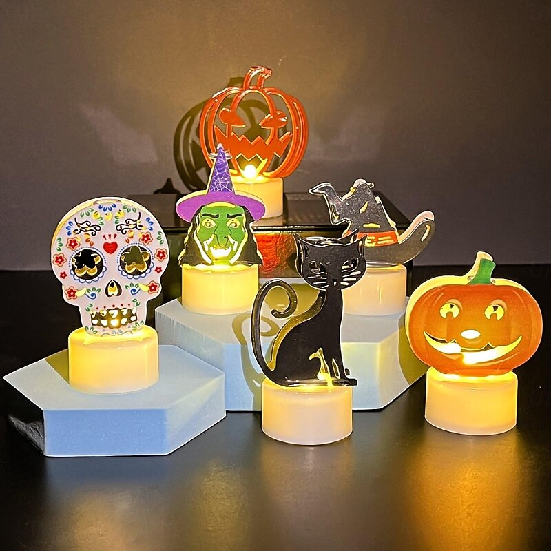 6 Pcs/1set Halloween LED Candle lights Decorative Pumpkin Witch Black Cat Skull Witch Hat Indoor Festival Party Restaurant Halloween Atmosphere Decorative Lights 6