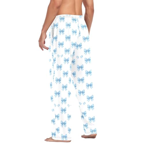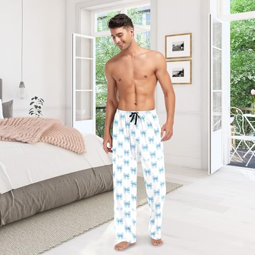 HOT ! Men's Watercolor Blue Bows Pajama Pants with Pockets - Straight Fit Cotton Sleep Bottoms for Lounge & Nightwear#553