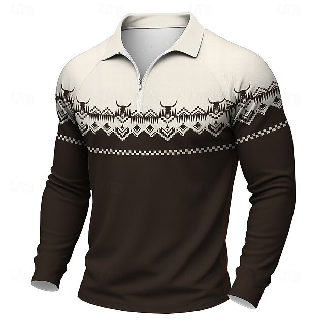 popular ! Men's Graphic Western Wear Polo Long Sleeve Polo Shirts Casual Western Style Outdoor Daily Wear 3D Print Quarter Zip Polo Spring Fall Winter Black Blue Brown